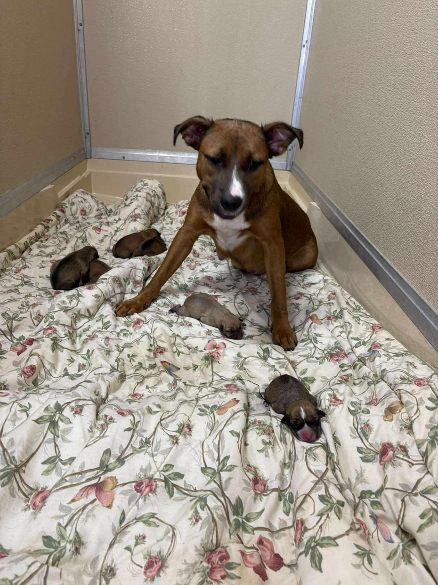 This sweet and brave mama managed to deliver puppies in a loud and crowded shelter in rural VA. While a shelter is a safer place than the woods to give birth, we are desperate to get mom and her puppies into a foster home to keep them safe and healthy. Can you please help us cover the cost of transport and vet care for this tired mama and her pups?